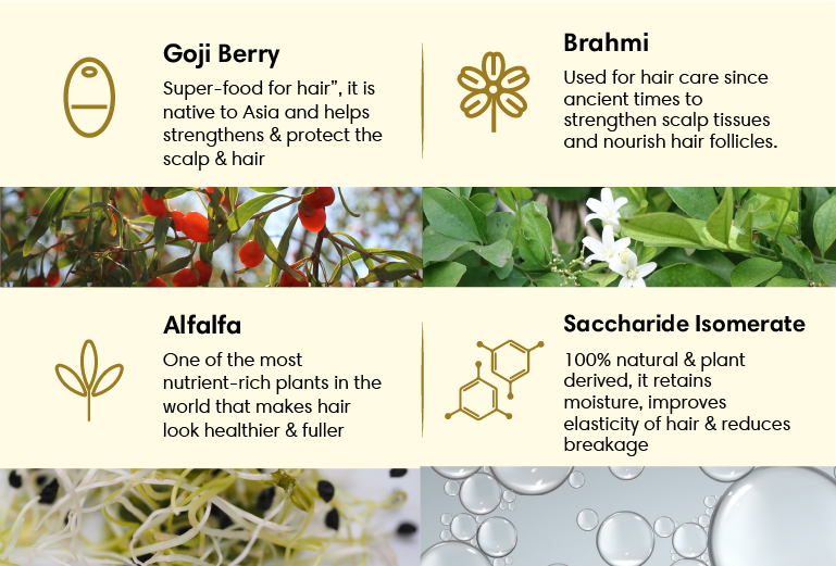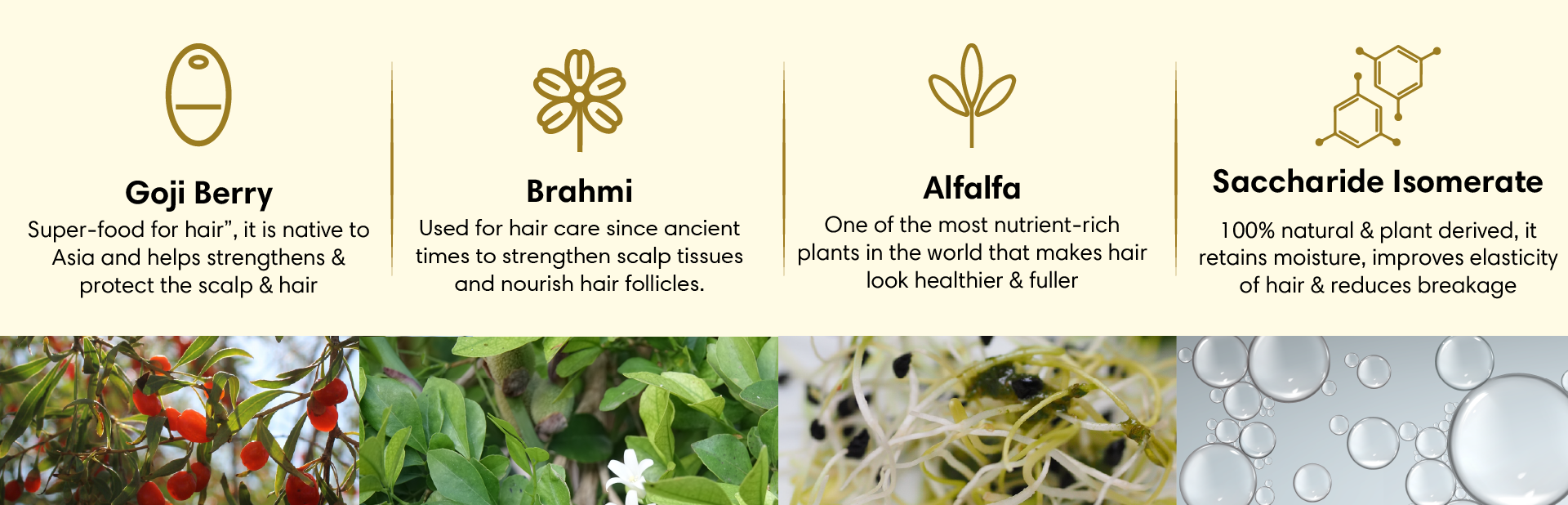 Brahmi Extract, Alfalfa Extract, Gojiberry Extract, Cetostearyl alcohol, Cetyl alcohol, Behentrimonium chloride, Polydimethylsiloxane, Amodimethicone & Trideceth-12 & Cetrimonium Chloride, Phenoxyethanol, Isopropyl Myristate, Saccharide Isomerate & Aqua & Citric Acid & Sodium Citrate (plant-derived), Ubiquinone & Tocopheryl Acetate & Squalane, Disodium Edetate, Neem extract (Indian Lilac), , Amla Extract (Indian Gooseberry), Reetha Extract (Indian soapberry), Hops Extract, Fragrance, Purified water.