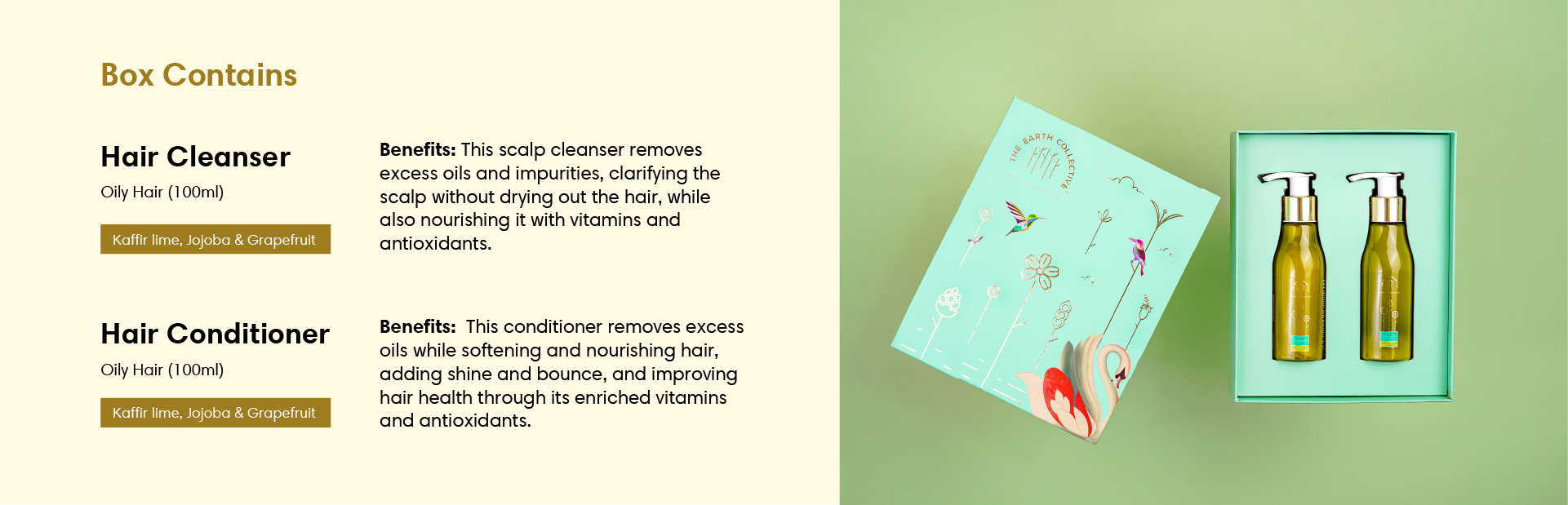 The Detox Blend is the perfect box for those looking for a non-greasy formula for their hair. Purify your scalp & revitalise your hair with The Earth Collective Cleanser and Conditioner for Oily Hair. With the goodness of Kaffir lime, Jojoba and Grapefruit, this box is all you need to detox your oily scalp and nourish your hair using the best of nature combined with science.