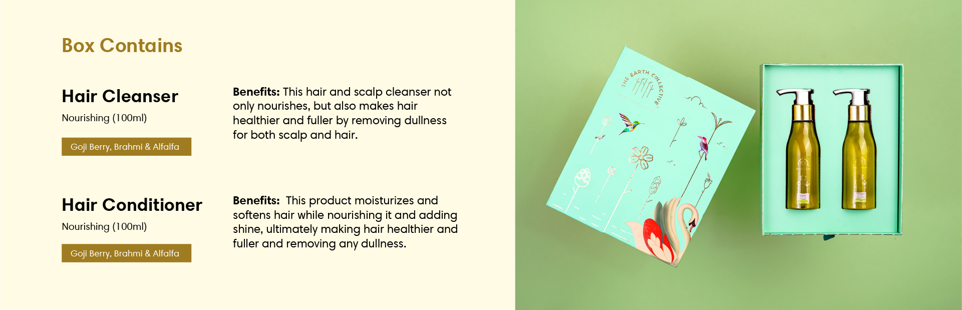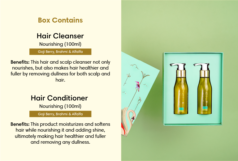 The Nourishment Blend is a dose of good health for your hair. Containing our Nourishing Hair Cleanser and Conditioner, this box is all you need to bring back the bounce in your locks. Enriched with Goji berry, Brahmi and Alfalfa that are sourced from all around the world, this box is the perfect gift for yourself or your loved ones.