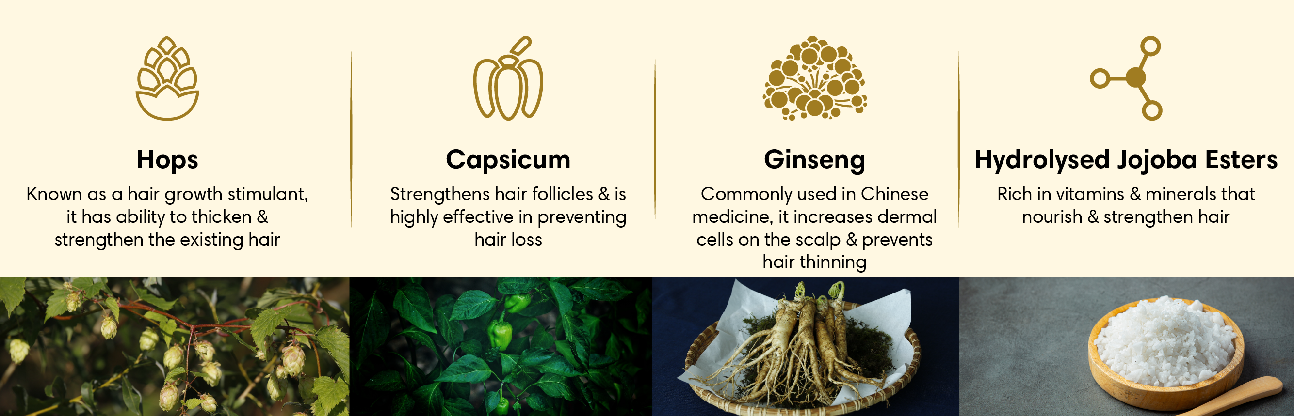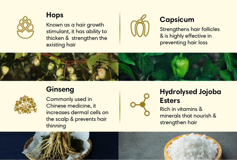 Capcicum Extract, Ginseng Extract, Hops Extract, Cetostearyl alcohol, Cetyl alcohol, Behentrimonium chloride, Polydimethylsiloxane, Amodimethicone & Trideceth-12 & Cetrimonium Chloride, Isopropyl Myristate, Disodium Edetate, Hydrolyzed Jojoba Esters, Phenoxyethanol, Neem extract (Indian Lilac), Amla Extract (Indian Gooseberry), Reetha Extract (Indian soapberry), Fragrance, Purified Water.