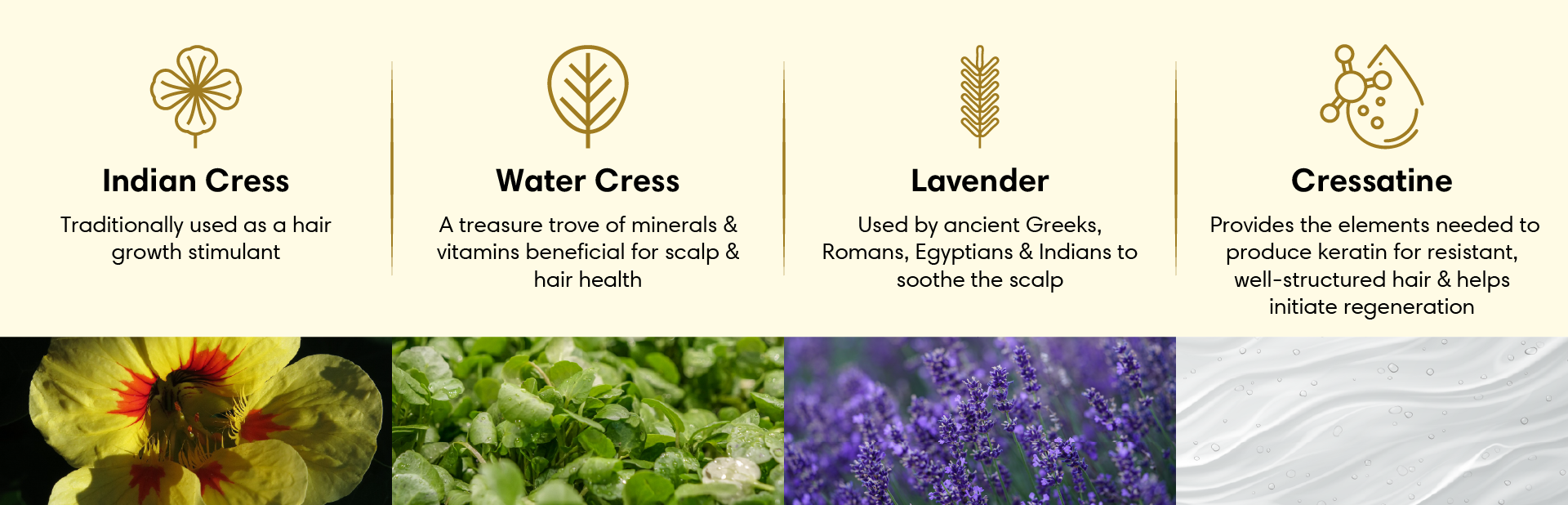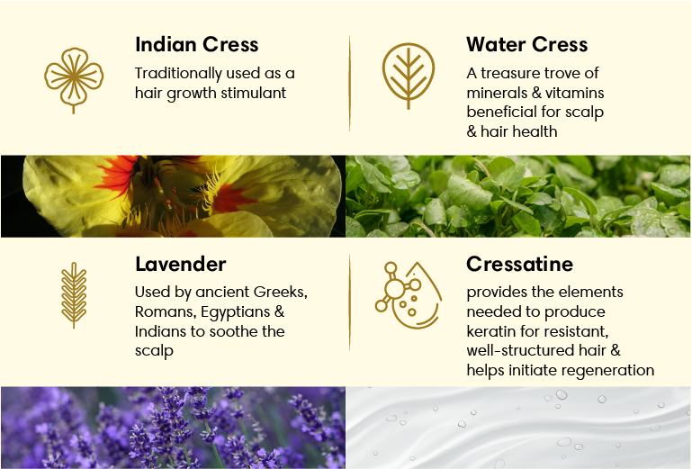 Cressatine (Indian cress & watercress), Lavender, Cetostearyl alcohol, Cetyl alcohol, Behentrimonium chloride, Polydimethylsiloxane, Amodimethicone & Trideceth-12 & Cetrimonium Chloride, Phenoxyethanol, Isopropyl Myristate, Disodium Edetate, Phytantriol, Hydrolyzed Jojoba Esters, Neem extract (Indian Lilac), Amla Extract (Indian Gooseberry), Reetha Extract (Indian soapberry), Fragrance, Purified water.