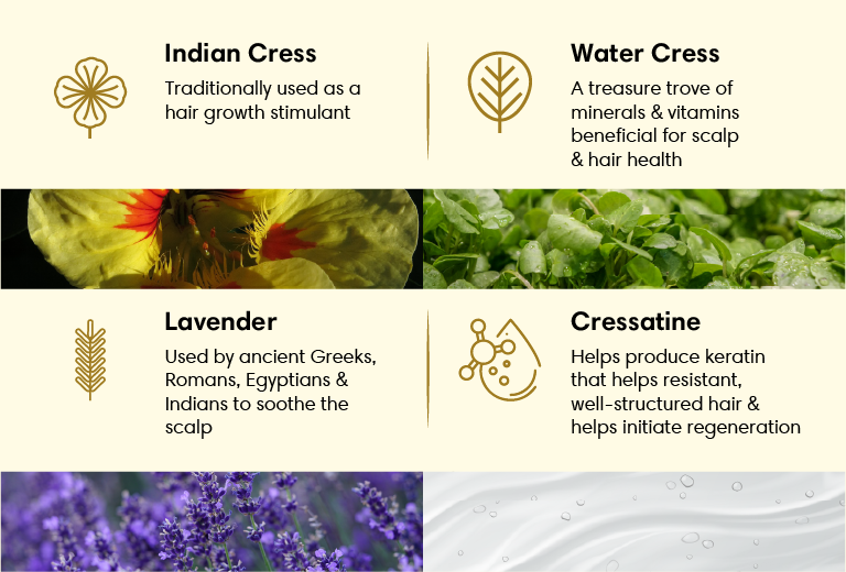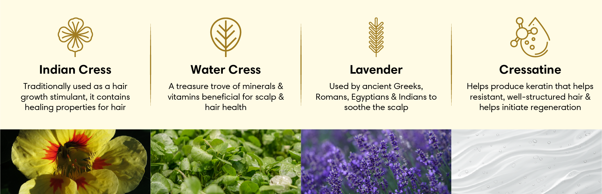 Cressatine( Indian cress & water cress), Lavender, Sodium C14-16 olefin sulfonate & Sodium cocoamphoacetate & Cocamide MEA, Cocamidopropyl betaine, Sodium lauroyl sarcosinate, Acrylates Copolymer, coco-glucoside, Glycerine, Ethylene glycol Distearate, Amodimethicone & Trideceth-12 & Cetrimonium Chloride, D Panthenol, Phenoxyethanol, Guar Hydroxypropyltrimonium Chloride, Polyquaternium 10, Disodium Edetate, Hydrolyzed Jojoba Esters, Sodium Hydroxide, Citric Acid, Fragrance, Purified water.