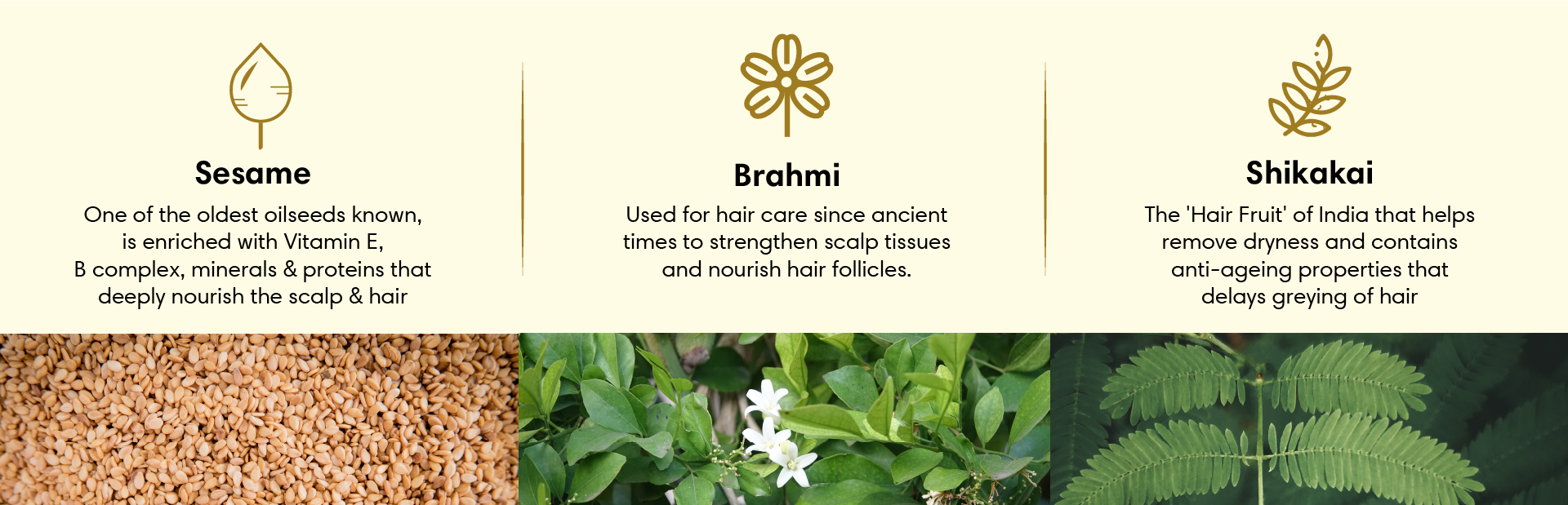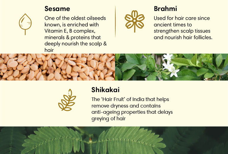 1. Sesame – one of the oldest oilseeds known, is enriched with Vitamin E, B complex, minerals & proteins that deeply nourish the scalp & hair