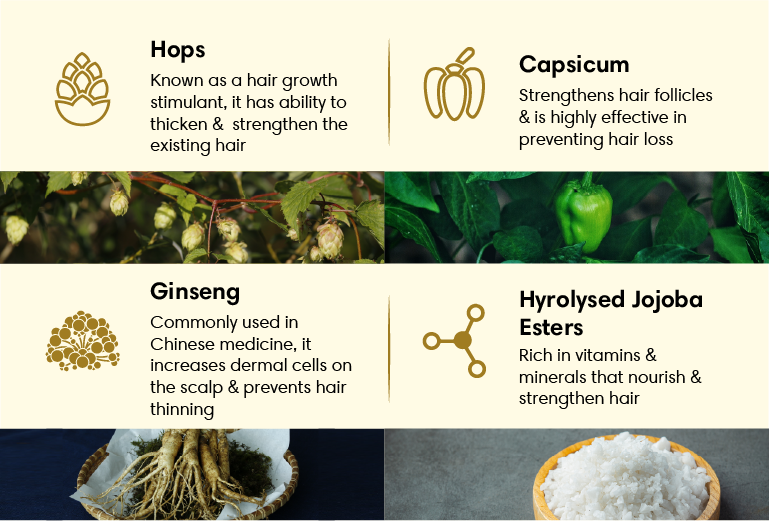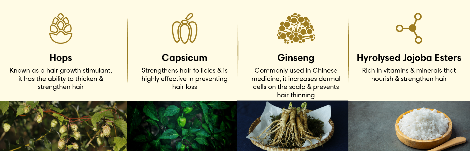 Capsicum Extract, Ginseng Extract, Hops Extract, Sodium C14-16 olefin sulfonate & Sodium cocoamphoacetate & Cocamide MEA, Cocamidopropyl betaine, Sodium lauroyl sarcosinate, Acrylates Copolymer, coco-glucoside, Glycerine, Silicone Quaternium-16 & Undeceth-11 & Butyloctanol & Undeceth-5, Ethylene glycol Distearate, Amodimethicone & Trideceth-12 & Cetrimonium Chloride, Hydrolyzed Jojoba Esters, Phenoxyethanol, Guar Hydroxypropyltrimonium Chloride, Polyquaternium 10, Citric Acid, Sodium Hydroxide, Fragrance, Purified water.