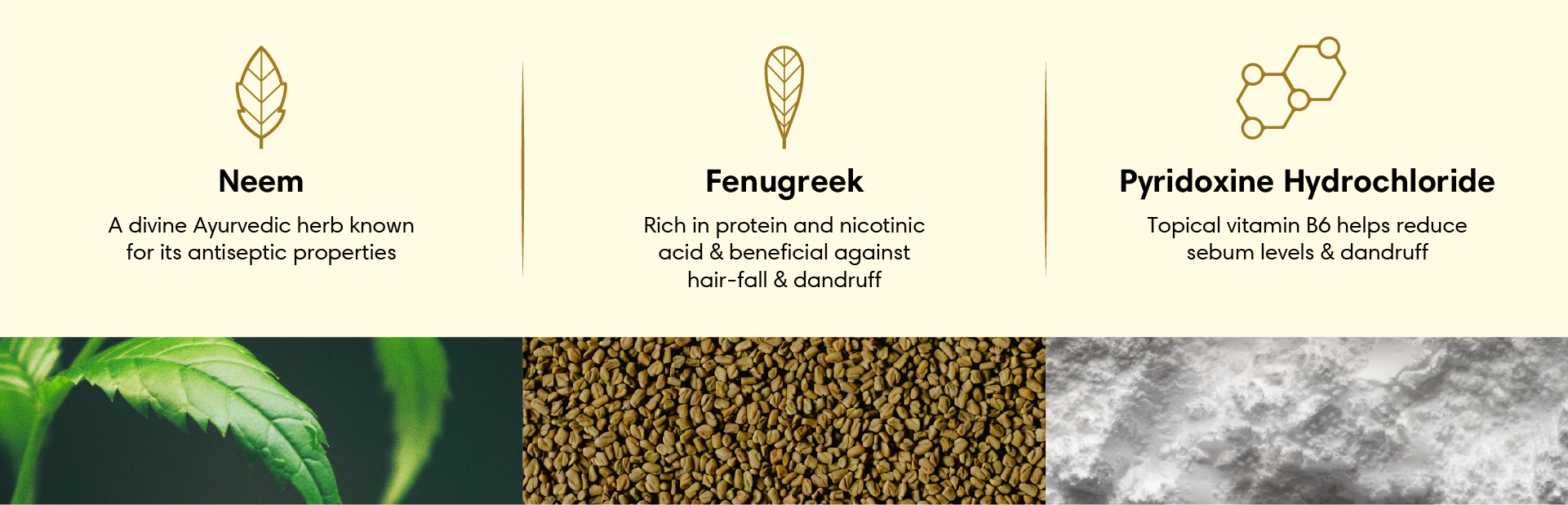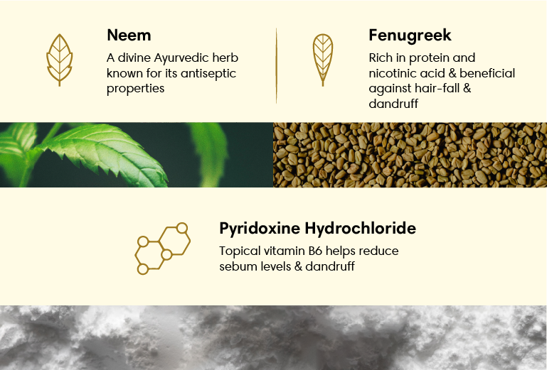 Fenugreek Extract, Neem Extract (Indian Lilac), Cetostearyl Alcohol, Cetyl Alcohol, Behentrimonium chloride, Polydimethylsiloxane, Amodimethicone & Trideceth-12 & Cetrimonium Chloride, Phenoxyethanol, Iso proyl Myristate, Disodium Edetate, Pyridoxine Hydrochloride, Amla Extract (Indian Gooseberry), Reetha Extract (Indian soapberry), Fragrance, Purified Water