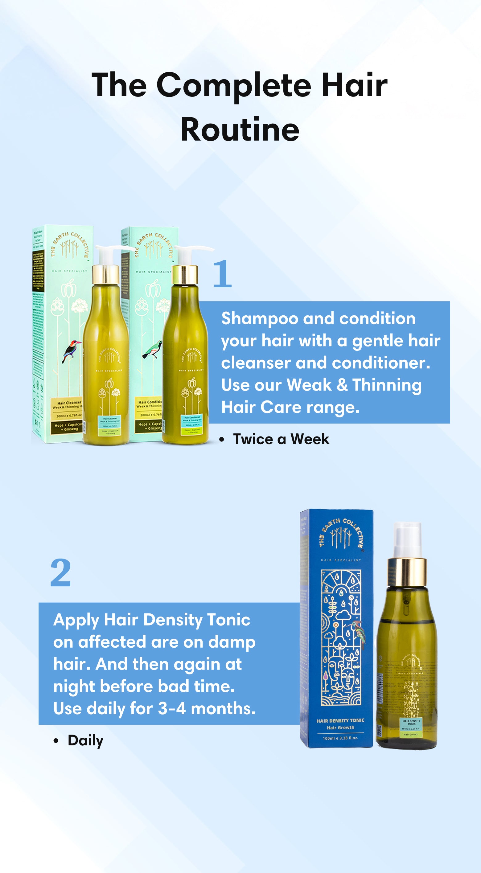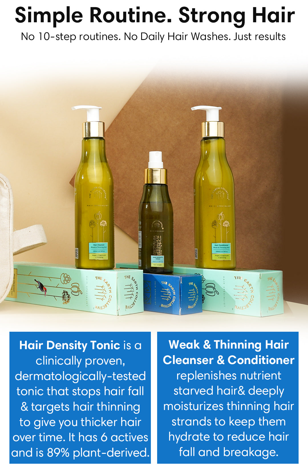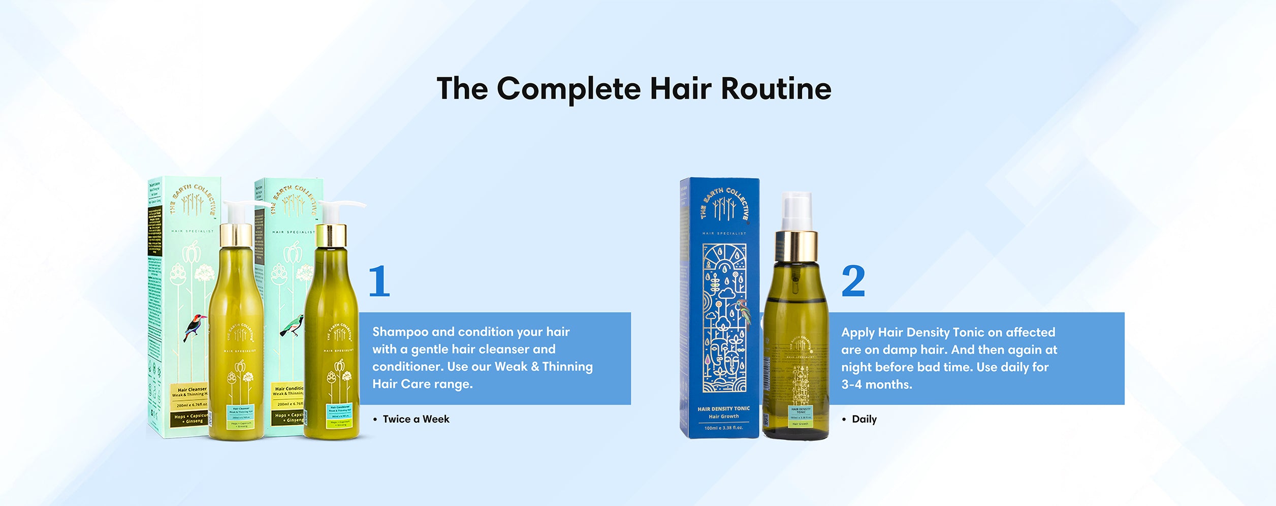 - Hair Wash Days: Use The Weak & Thinning Hair Cleanser & Conditioner. Apply the cleanser on your wet scalp, massage it in and wash it off. Follow it up with the conditioner. Apply generously from mid-length to ends. Leave on for 3 minutes & wash off.