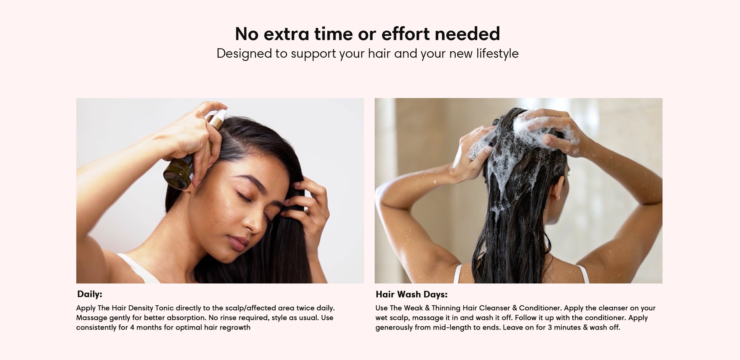 - Daily: Apply The Hair Density Tonic directly to the scalp/affected area twice daily. Massage gently for better absorption. No rinse required, style as usual. Use consistently for 4 months for optimal hair regrowth.