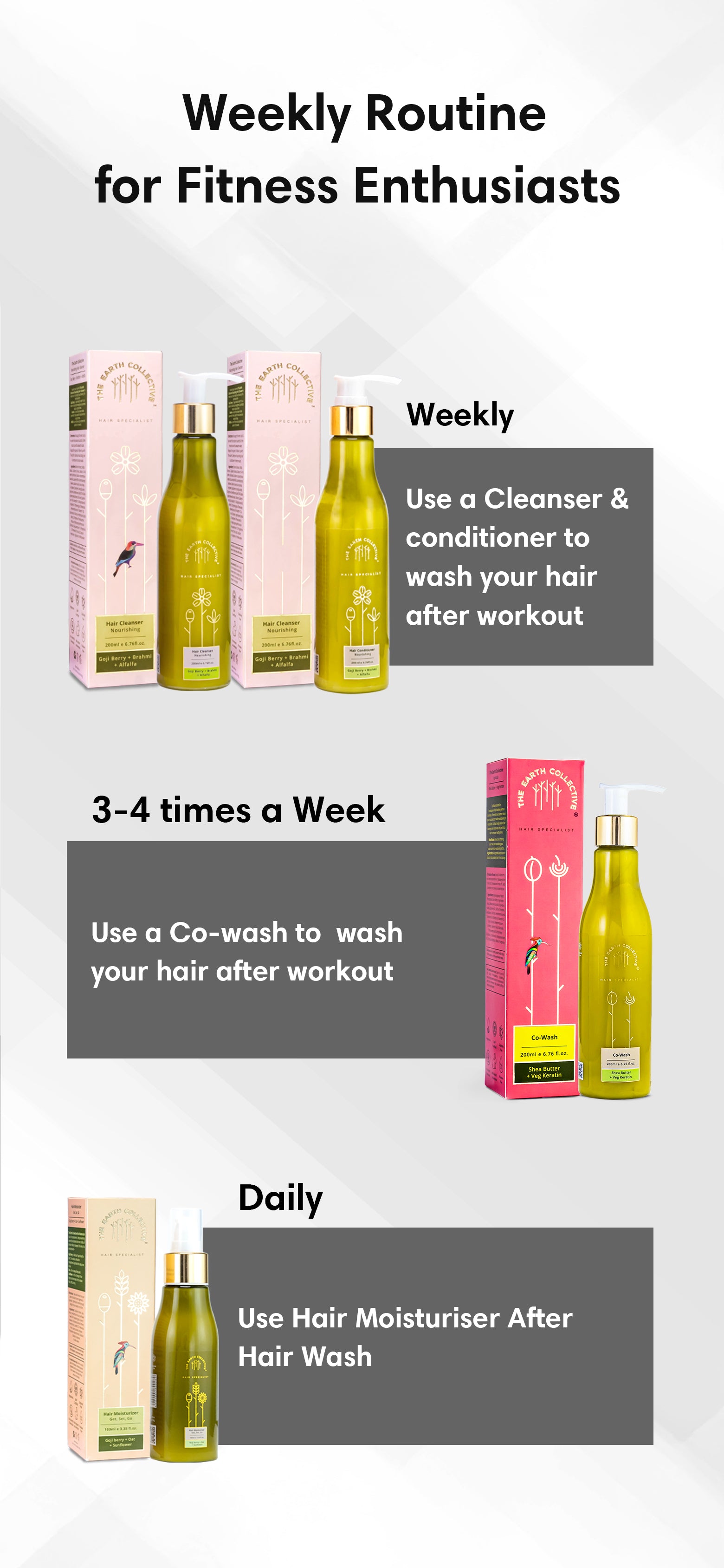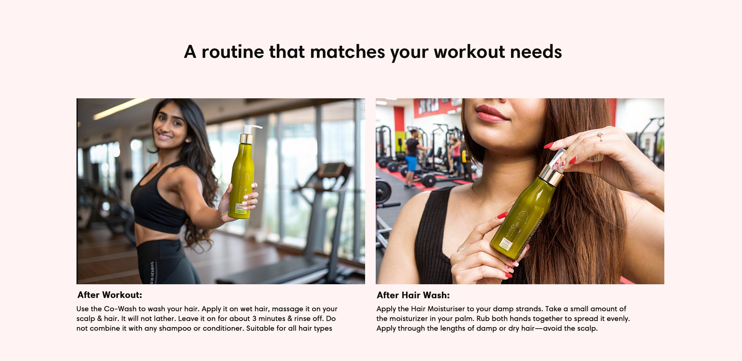 - After workout, use our Co-Wash to cleanse your hair and remove sweat. This single product gently cleanses and conditions both scalp and strands — the perfect quick hair wash after gym.