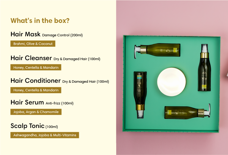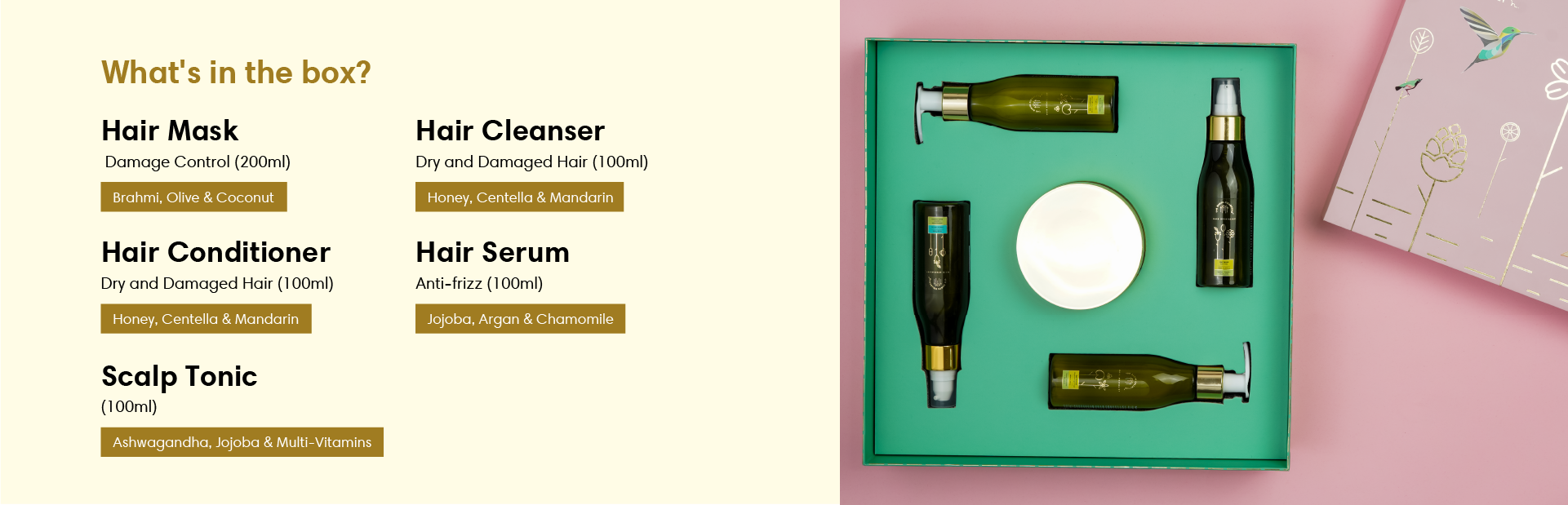 This gift box has our Dry & Damaged Hair Cleanser, Dry & Damaged Hair Conditioner, Damage Control Hair Mask, Anti-Frizz Hair Serum & Scalp Tonic