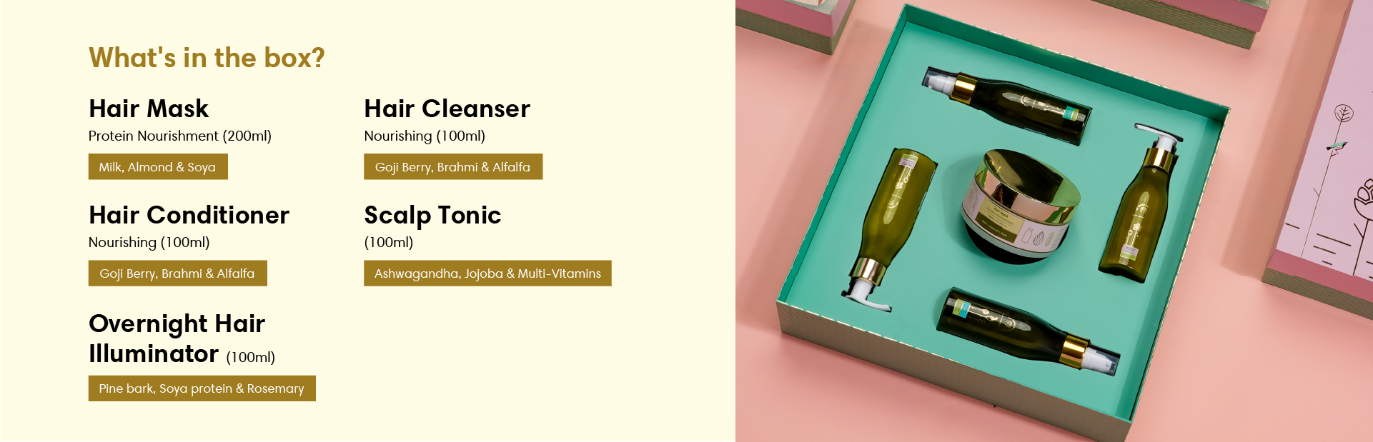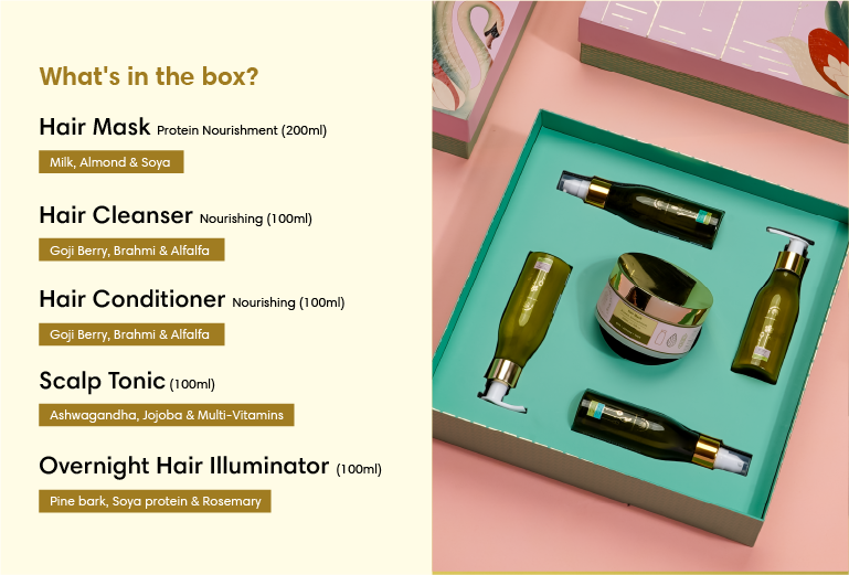 This gift box has our Nourishing Hair Cleanser, Nourishing Hair Conditioner, Protein Nourishment Hair Mask, Overnight Hair Illuminator & Scalp Tonic