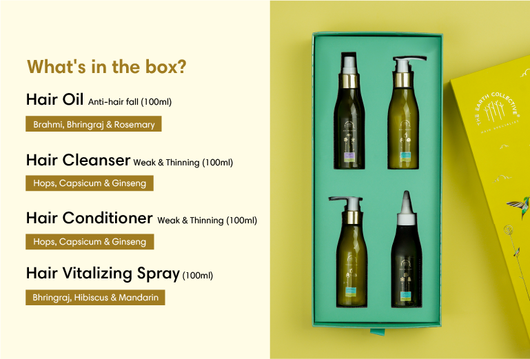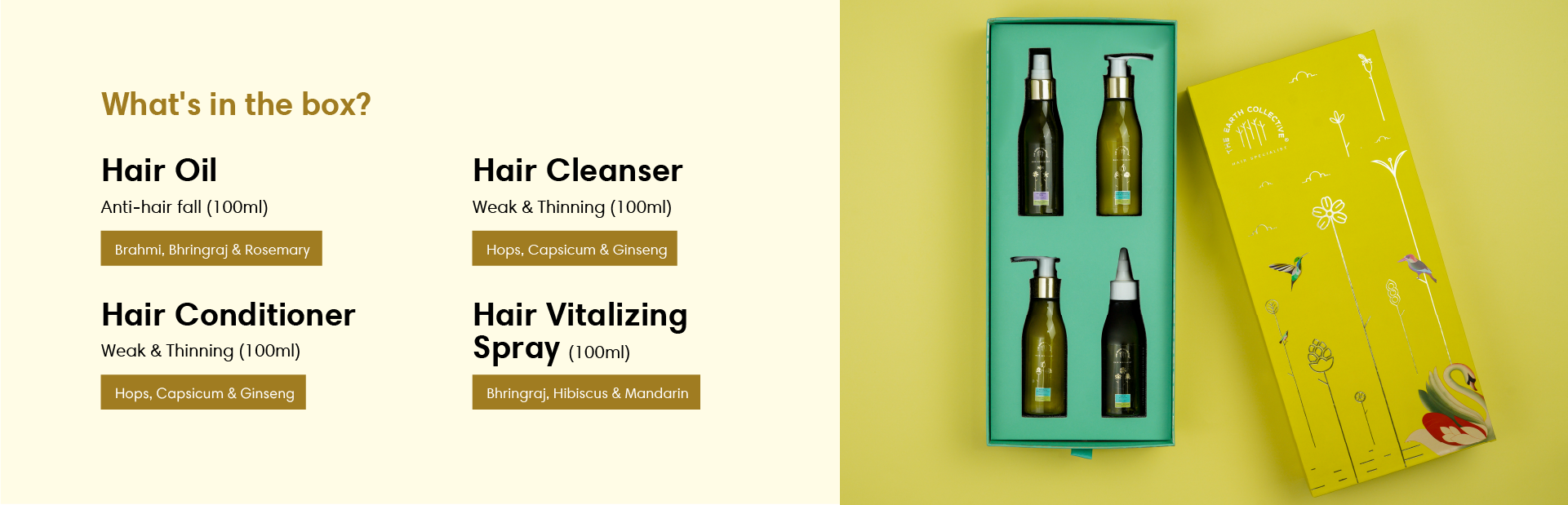 This gift box has our Weak & Thinning Hair Cleanser, Weak & Thinning Hair Conditioner, Anti-Hair Fall Hair Oil & Hair Vitalizing Spray.