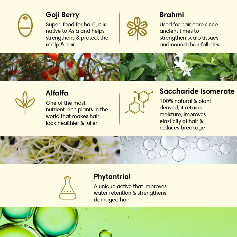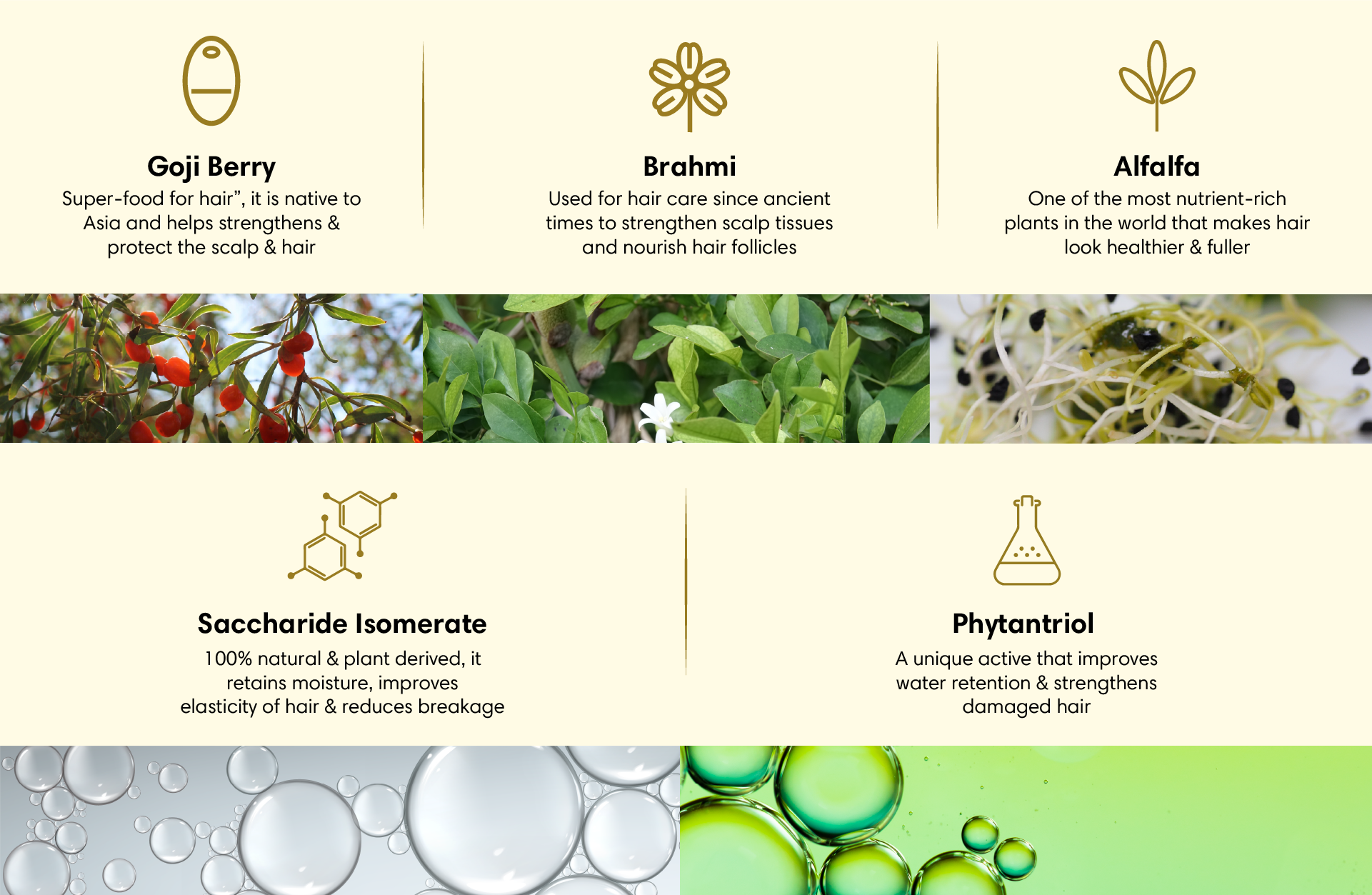 Brahmi Extract, Alfalfa Extract, Gojiberry Extract, Cetostearyl alcohol, Cetyl alcohol, Behentrimonium chloride, Polydimethylsiloxane, Amodimethicone & Trideceth-12 & Cetrimonium Chloride, Phenoxyethanol, Isopropyl Myristate, Saccharide Isomerate & Aqua & Citric Acid & Sodium Citrate (plant-derived), Ubiquinone & Tocopheryl Acetate & Squalane, Disodium Edetate, Neem extract (Indian Lilac), , Amla Extract (Indian Gooseberry), Reetha Extract (Indian soapberry), Hops Extract, Fragrance, Purified water.