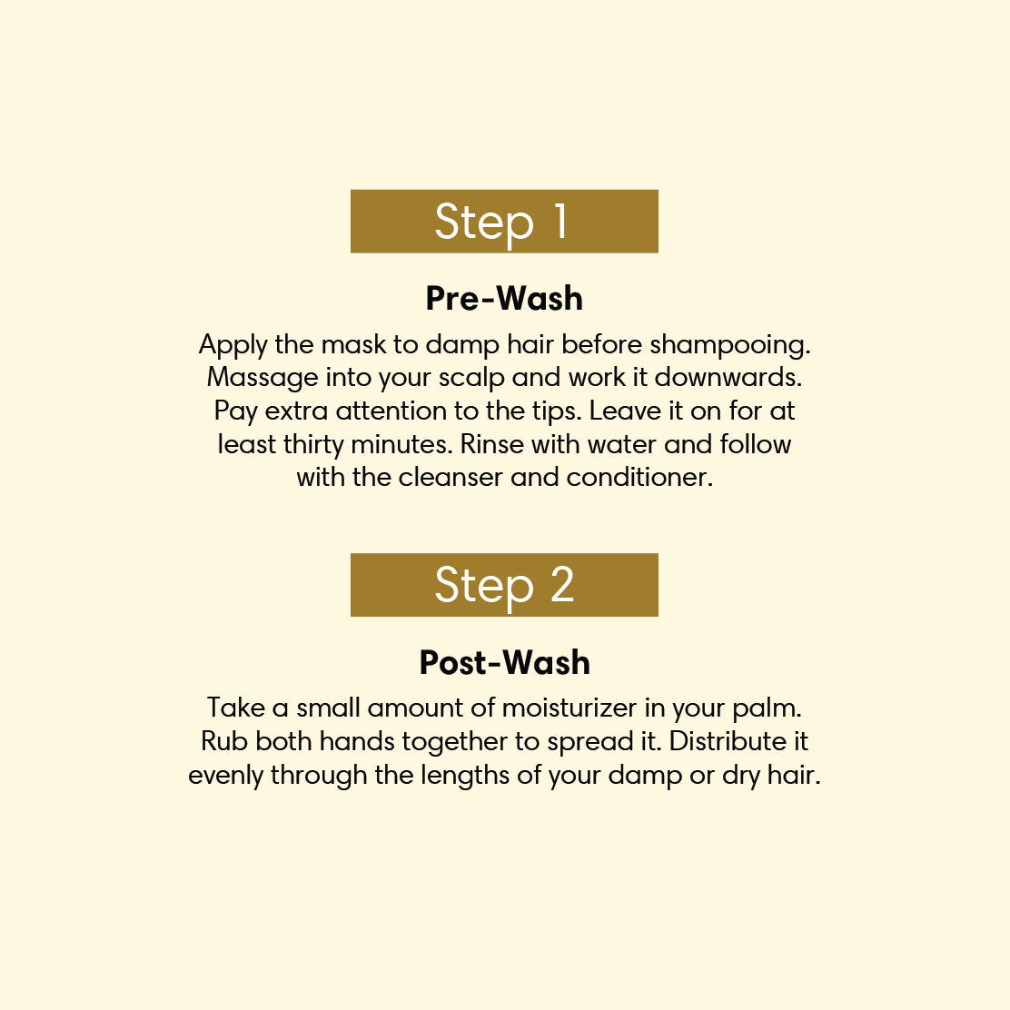 Step 1 - Apply the Hair Mask to damp hair. Leave it on for at least 20 minutes before your hair wash.